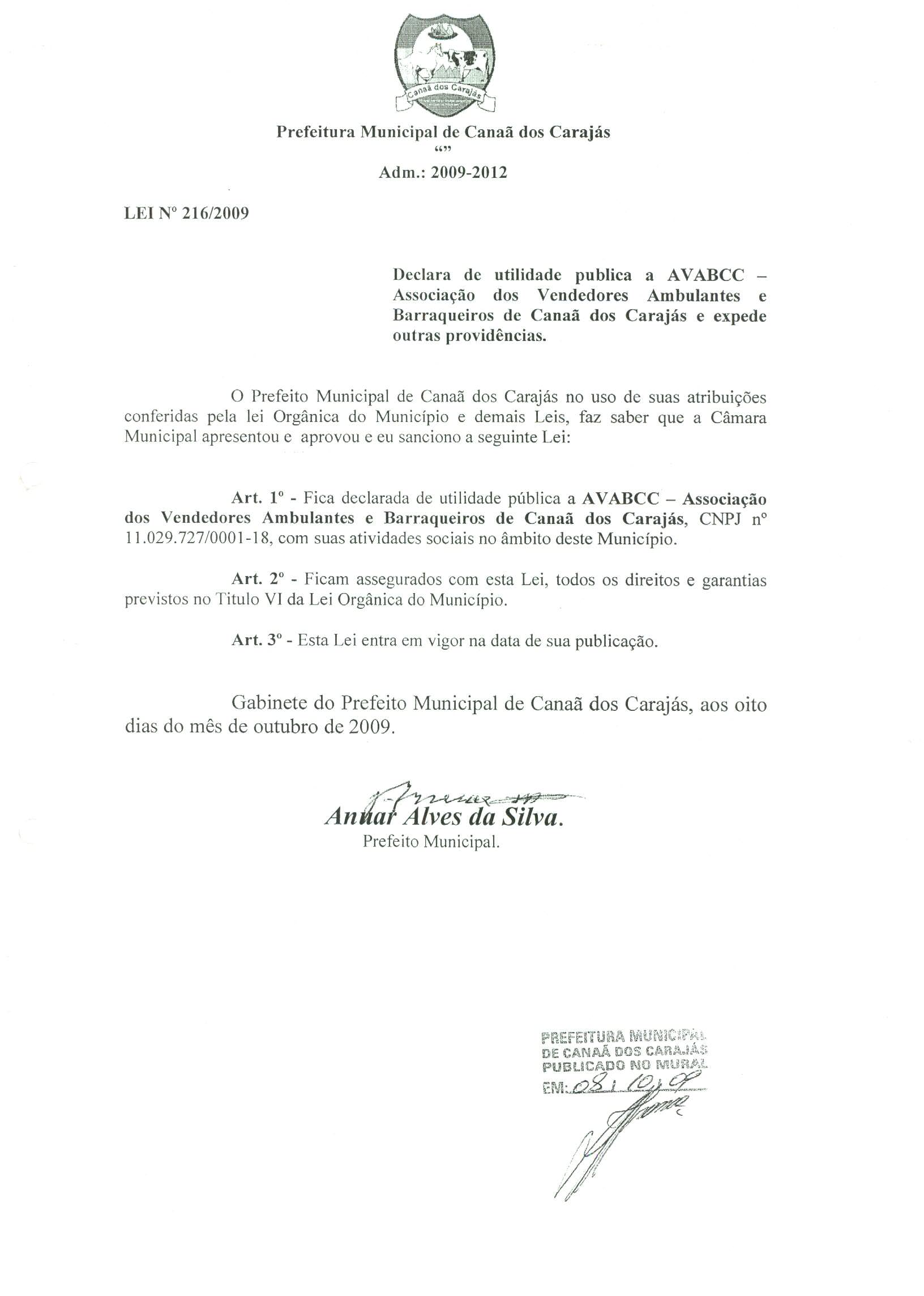 Lei nº 216, de 08 de outubro de 2009